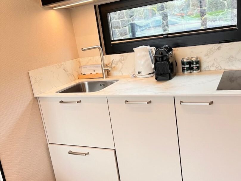 - w pełni wyposażona kuchnia (lodówka, płyta, czajnik, ekspres, naczynia),